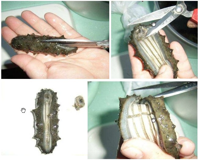 待海参全部回软后无硬芯后,先清洗干净海参表面,然后沿海参的原扩刀口向上剪至头部,向下剪至尾部,去掉海参头部的白色的石灰质的环形骨板(俗称海参牙),然后清洗干净海参内脏,再把海参的筋(体壁内腺管),一般有5条,沿着与筋垂直的方向轻轻挑剪断,根据海参的大小,每条剪为2-3段,剪筋的时候不要伤到海参的表皮。海参的头部有一些絮状的触手,可保留食用。注意:剪刀不能有油。